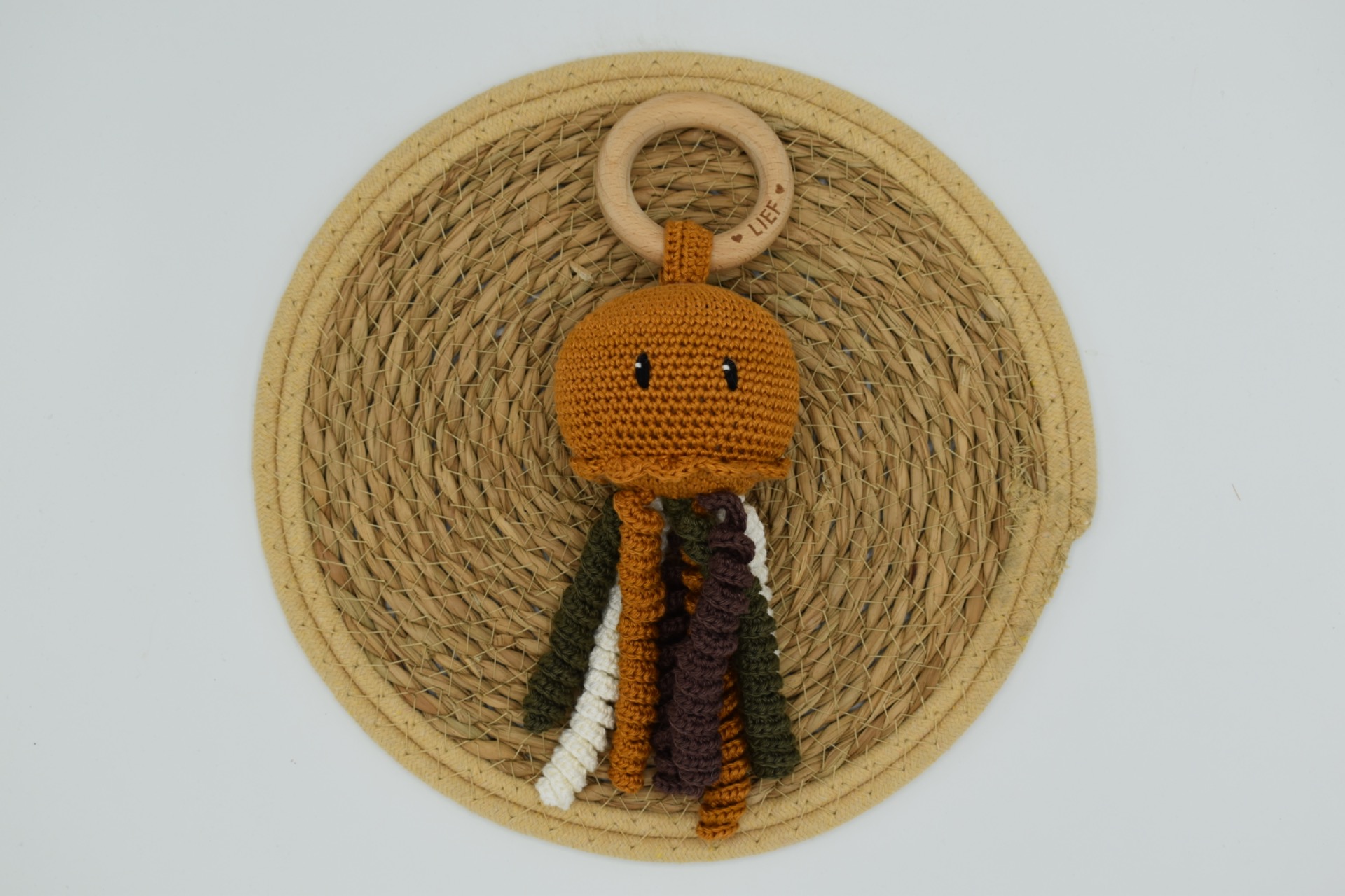 De kwal is gehaakt met 100% katoen, bevat een rammelkraal en heeft geborduurde oogjes. De rammelaar kan met de hand gewassen worden