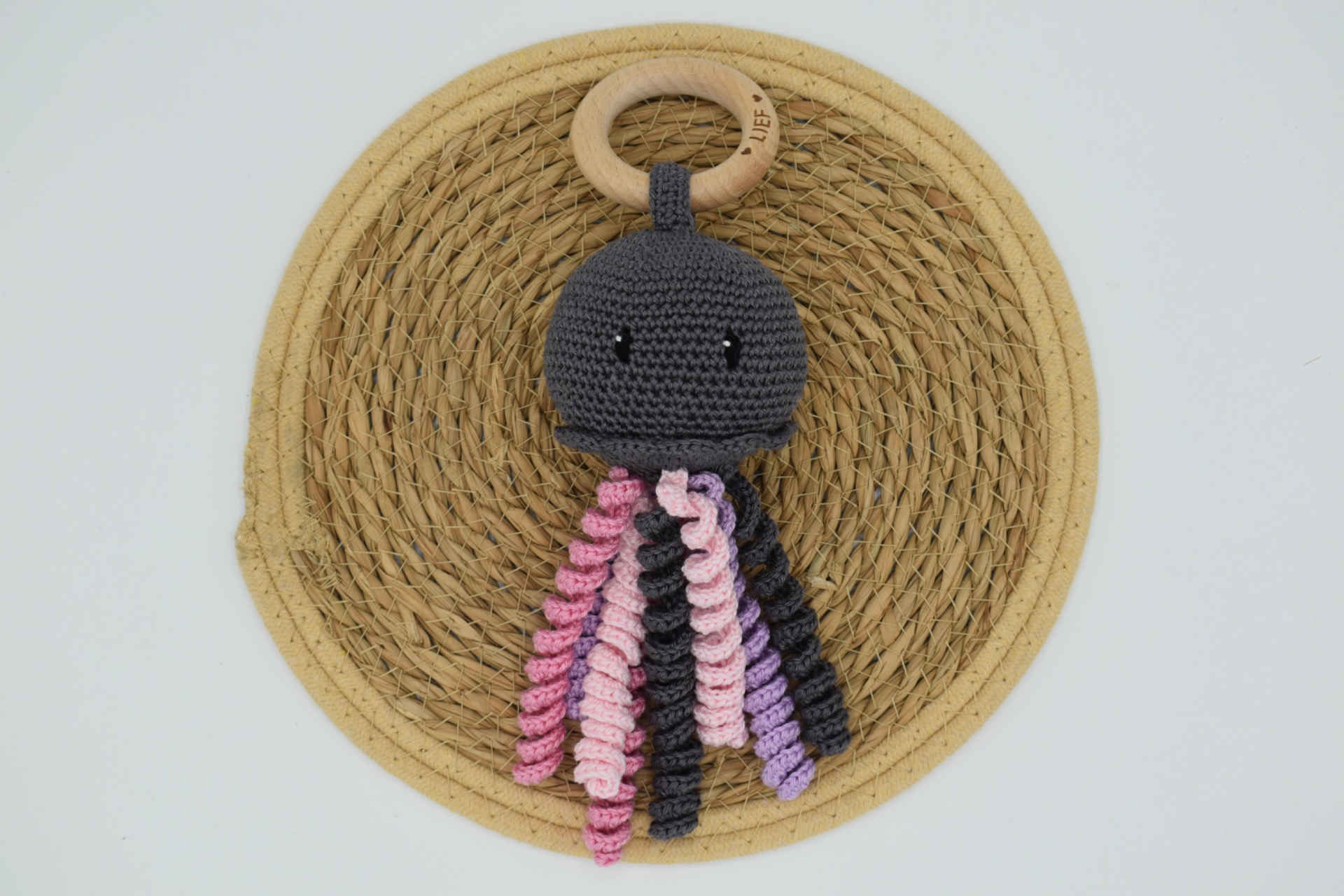 De kwal is gehaakt met 100% katoen, bevat een rammelkraal en heeft geborduurde oogjes. De rammelaar kan met de hand gewassen worden.