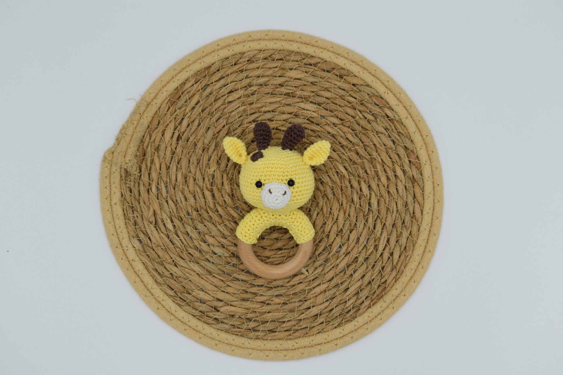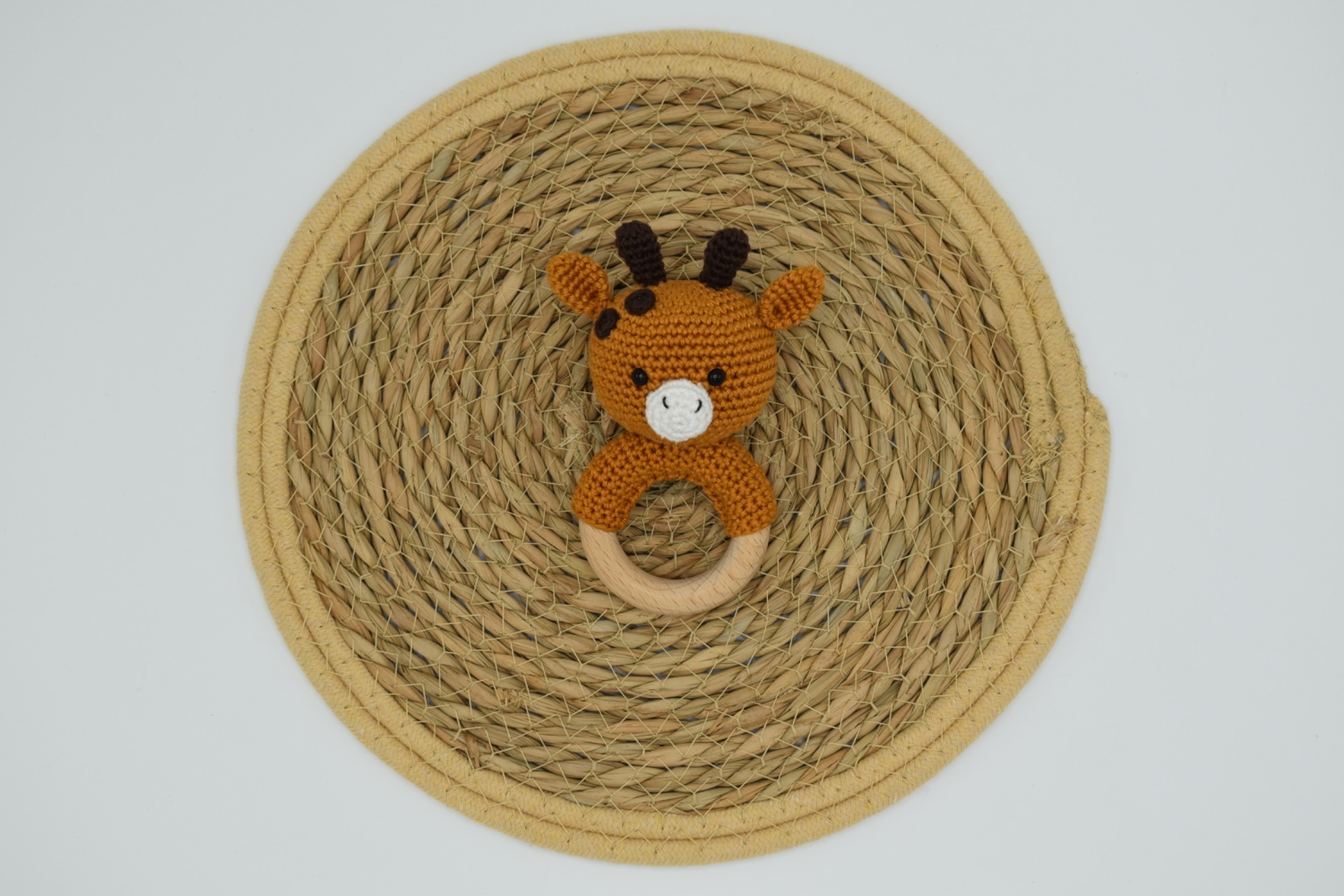 De giraffe is gehaakt met catania katoen, bevat een rammelkraal en veiligheidsoogjes. De rammelaar kan met de hand gewassen worden.